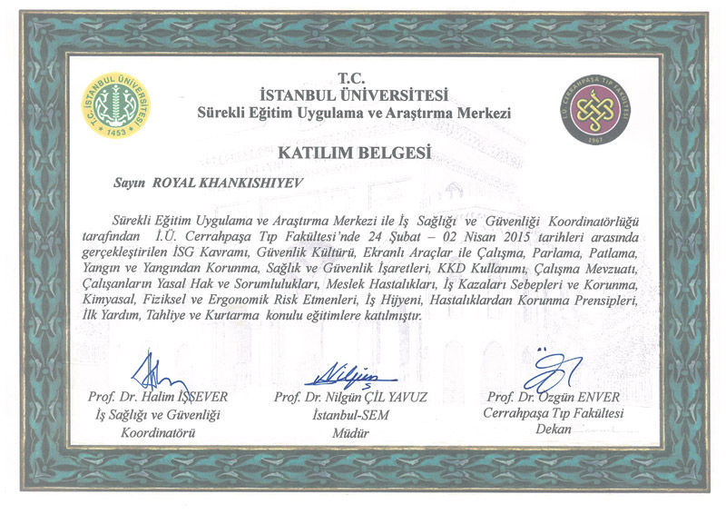 Dr. Royal Khankishiyev was born in Azerbaijan, He graduated at Bakü high school number 170. He graduated with a Medicine degree in Azerbaijan in 2010. He has certificates of outstanding achievements throughout his education life, and at the same time he got highest degrees in many scientific competitions such as the chemistry olympics.