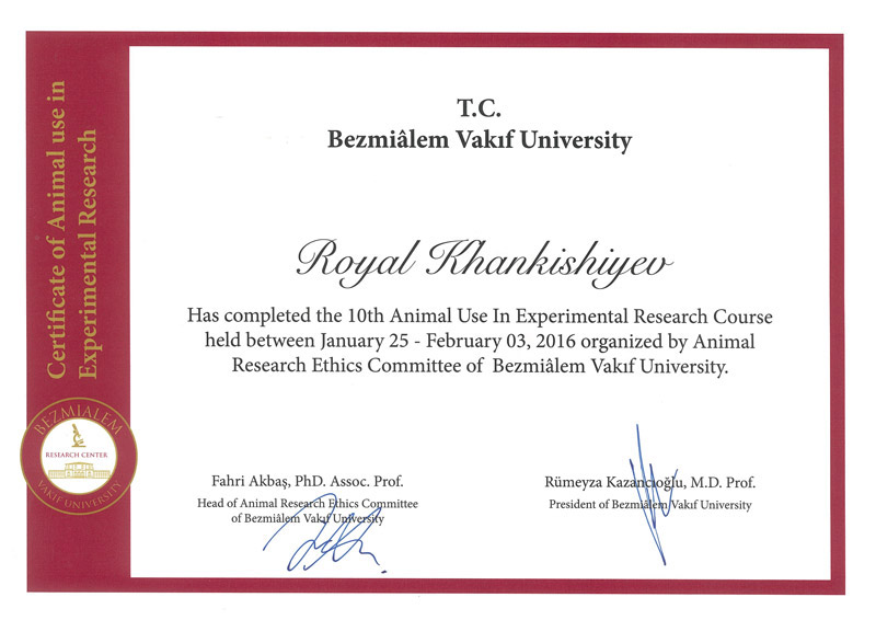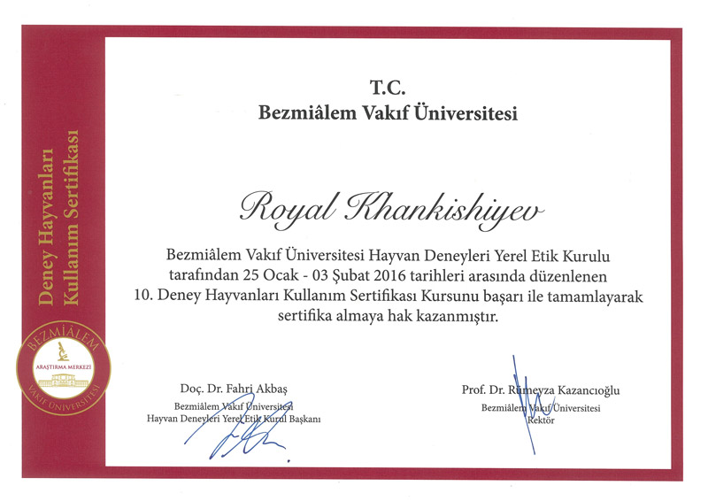Experimental Animals Use Certificate 2016 Bezmi- Alem Vakıf University