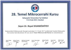 Dr. Royal Khankishiyev has participated in many academic activities, at the same time, he published an academic article in - An International journal of surgical reconstruction- magazine by the title: Propeller and Pre-expanded Propeller Use of a Transversely Oriented Upper Trapezius Perforator Flap in Head and Neck Reconstruction: Clinical Experience and Review of Vascular Anatomy of the Supraspinal Trapezius Muscle at 2021. At the same time, investigation of ING-2 gene functions in malignant melanoma, which is one of the first studies conducted in Turkey (clinical study), was carried out in 2018.